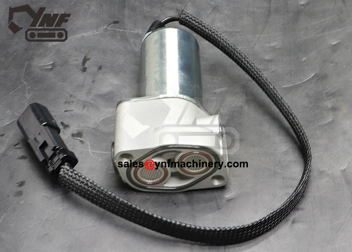 This solenoid valve is used in the hydraulic control system of Komatsu PC450-8 excavators to regulate fluid flow and activate specific hydraulic functions within the machine.